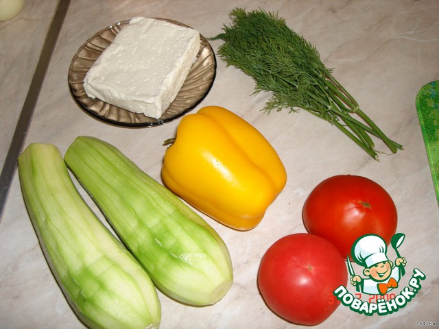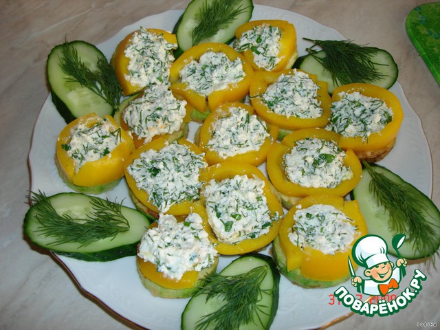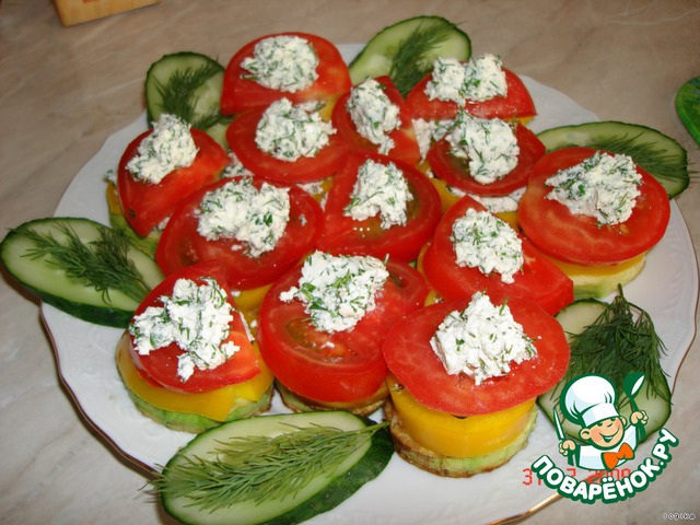 | Чудесное сочетание овощей с соленым творогом. Можно, также, использовать творожный или плавленый сыр. На конкурс «Овощной светофор». |