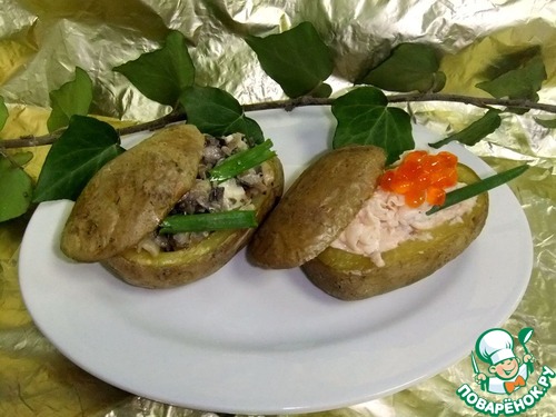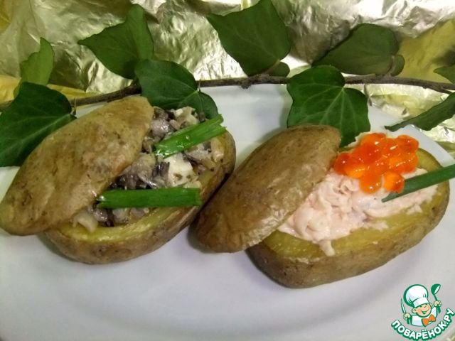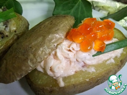 Достать из духовки картофель, дать немного остыть, развернуть и наполнить серединки нашими начинками. Украсить икрой и зеленым луком.