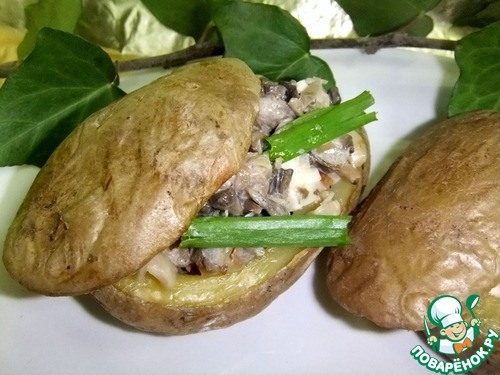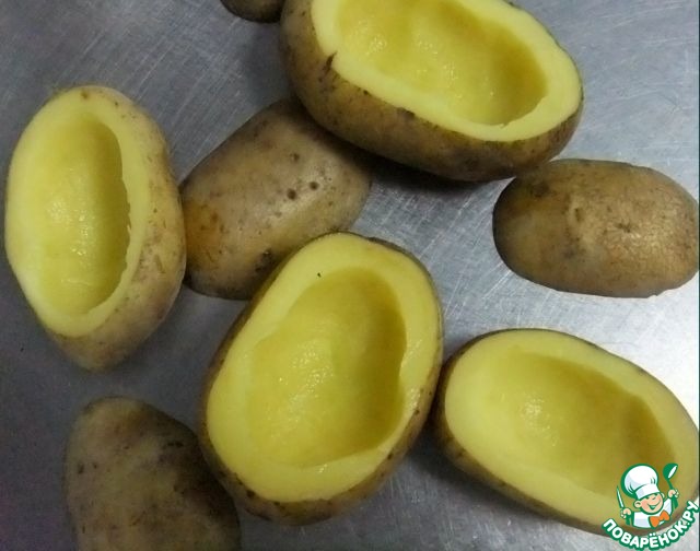 Вымыть щеточкой картофель, разрезать вдоль на две неравные части. Меньшая - это крышечка, большая - сундучок. Аккуратно вынуть чайной ложкой середину.