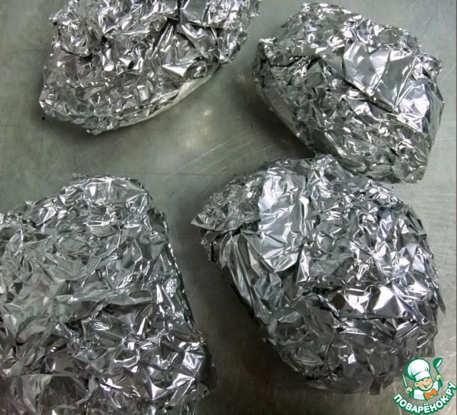 Сложить обе части вместе и завернуть в фольгу. Поставить в горячую духовку на 40-50 минут, а то и на час в зависимости от размера картофеля.