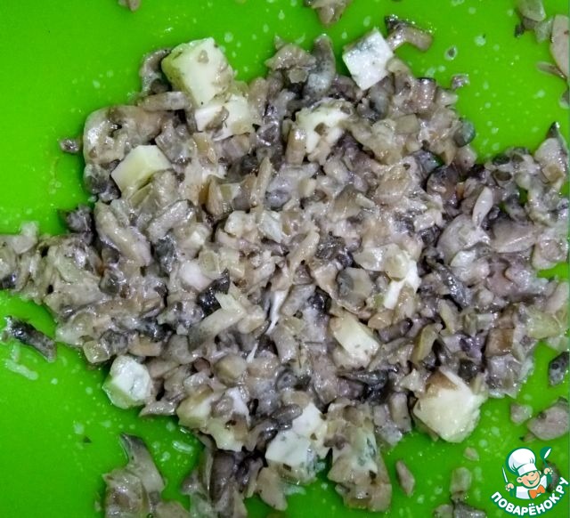 Тем временем приготовить начинки. Для первой грибы и лук мелко порезать и обжарить на оливковом масле. Если не любите, можно на сливочном. Убавить огонь, добавить сливки и сыр, порезанный кубиками. Посолить по вкусу. Начинка готова.