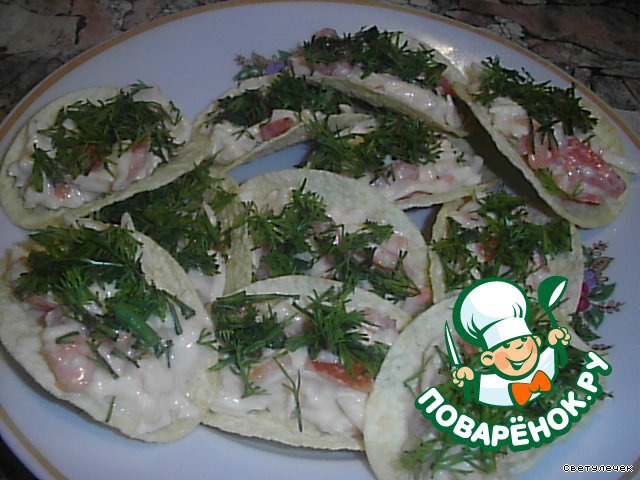 Готовый "фарш" выкладываем на крупные чипсы и украшаем мелко нарезанным укропом.