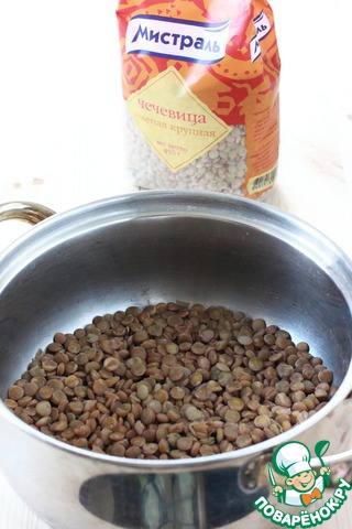 Итак, отварить зеленую чечевицу. На самом деле, можно брать любой вид чечевицы, я остановила свой выбор на зеленой, поскольку она даже после варки сохраняет свою форму, в отличие от красной, например, которая разваривается в кашу. Хотя в этом есть и свой плюс - красная чечевица будет прекрасно держать форму в этой закуске.
