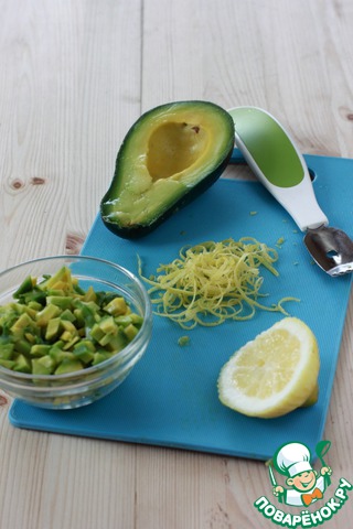 Лимон помыть, ошпарить кипятком и снять стружку с цедры. Авокадо очистить и мелко порезать, сложить в мисочку и щедро полить лимонным соком. Это не только придаст авокадо приятный вкус, но и предотвратит его от потемнения.