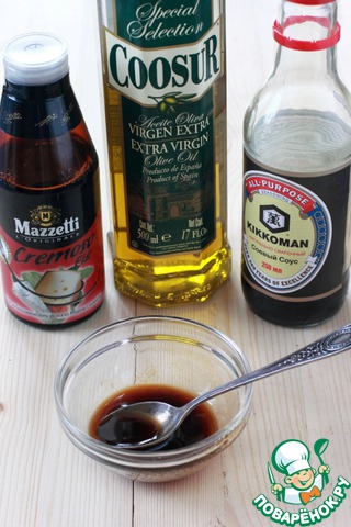 Приготовить соус. Смешать в равных частях соевый соус, бальзамический крем (можно заменить на бальзамический уксус, соус просто будет немного пожиже) и оливковое масло. Тут я дам совет - сразу много соуса не делайте.