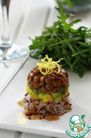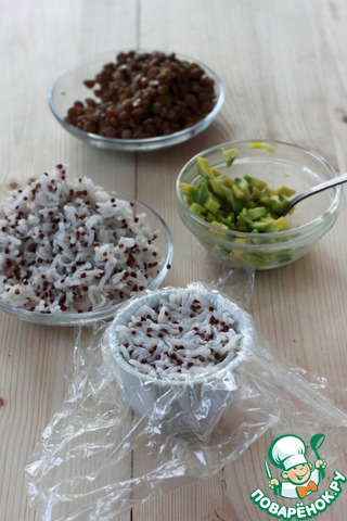 Ну и самое интересное в этом рецепте - сборка. Я в качесте формы использовала маленькие кофейные чашечки. Застелите форму пищевой пленкой, на 1/3 наполните ее чечевицей. Плотно утрамбуйте. Затем - авокадо. Утрамбовать. И микс киноа. Утрамбовать.