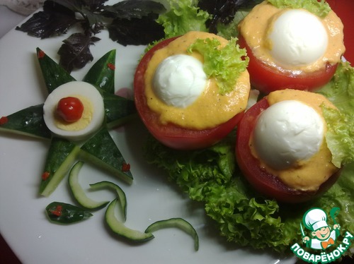 Берём подготовленные помидоры и кладём внутрь каждого по ложечке соуса, сверху вставляем очищенные варёные яйца. По краю помидор наливаем еще немного соуса, украшаем зеленью.