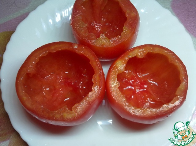 Срезаем с помидор шапочку и ложкой аккуратно вычищаем мякоть и семечки. Солим и перчим помидоры внутри.