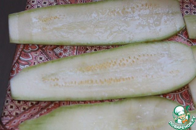 Кабачок нарезаем на тонкие полосы. Солим. У меня получилось 13 полос из среднего кабачка.