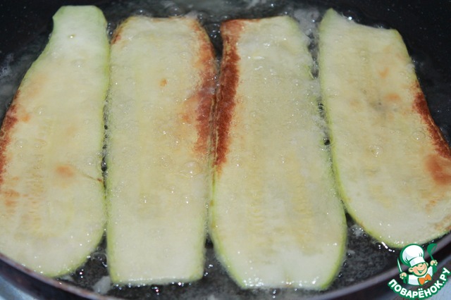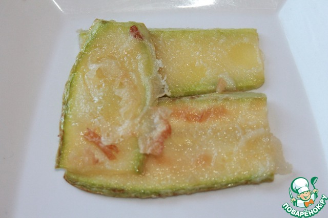 Обваливаем кабачок в муке и немного обжариваем на растительном масле с двух сторон. Выкладываем на салфетку для того чтобы убрать остатки масла.
