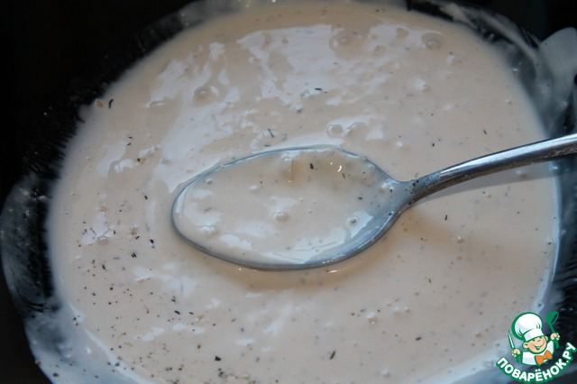Делаем соус. Для этого кефир смешиваем с приправой, базиликом, перцем, нарезанным мелко чесноком. Можете добавить немного лимона.