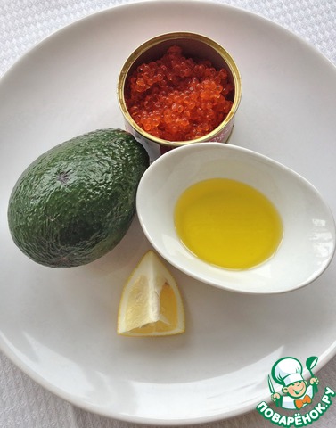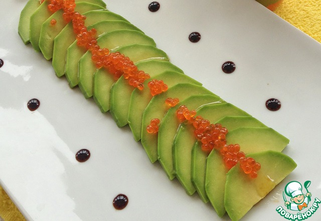 Выложить авокадо на блюдо. Полить заправкой. Сверху на авокадо выложить красную или черную икру.