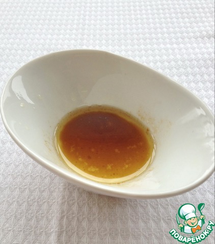 Приготовить заправку. Смешать оливковое масло с лимонным соком и соевым соусом (можно вместо соуса посолить).