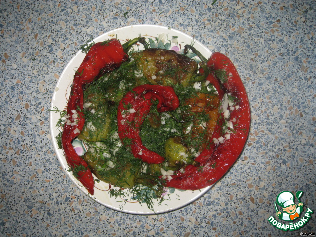 Готовый перец складываем, солим и посыпаем чесноком и укропом. Можно чуть подлить раскаленного масла. Приятного аппетита.