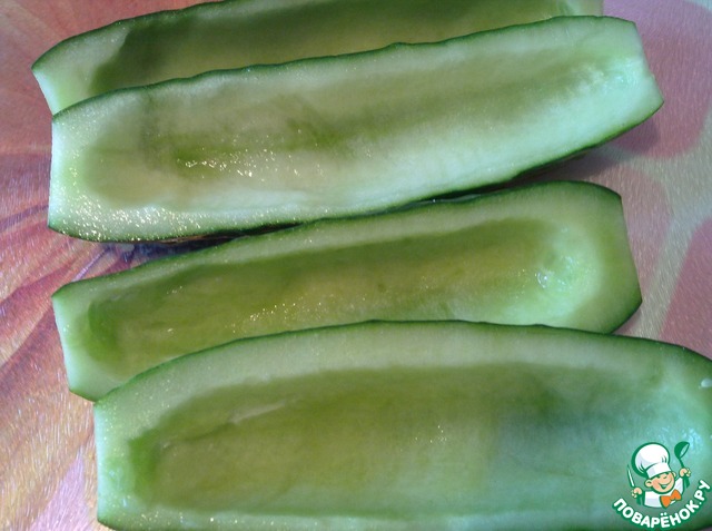 Огурцы моем и разрезаем их на две части. Отрежьте хвостики и очистите ножом от мякоти. Промокните салфеткой.