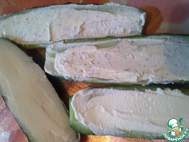 Берем любой мягкий сыр и фаршируем подготовленный огурец.
