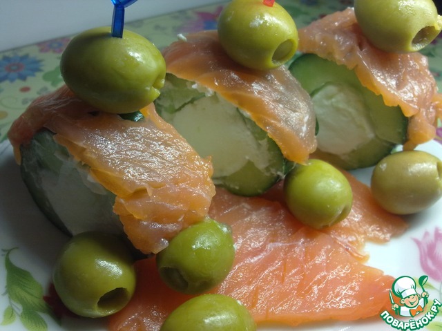 Соединяем половинки огурцов и разрезаем их на кусочки. Украсьте огурцы слабосолёной форелью и оливками. Приятного аппетита!