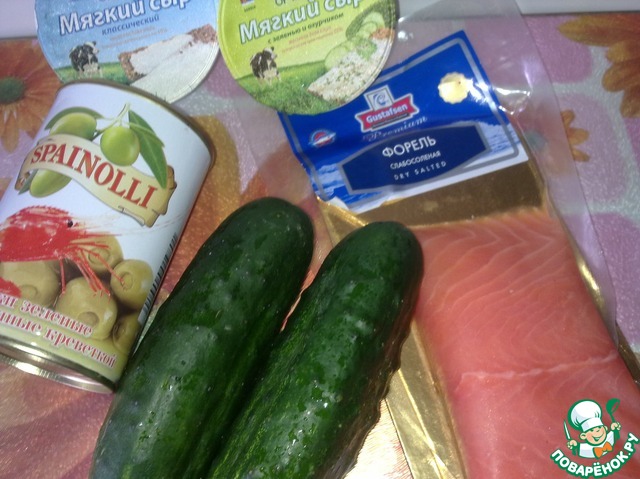 | Вкусная и освежающая закуска из огурцов, украсит ваш стол в любое время года, а особенно летом, когда стоит жара и не хочется находиться у плиты. Начинка в огурцах совершенно простая из мягкого сыра, а слабосолёная форель и оливки служат дополнением к фаршированным огурчикам. Угощайтесь дорогие поварята!!! |