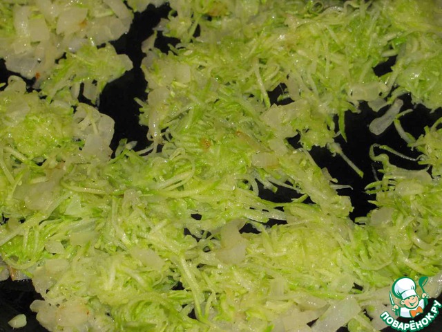 Лук мелко нарезать и обжарить на сливочном масле до золотистого цвета. Добавить половину тертых цуккини и подержать на огне 2-3 минуты. Снять с огня.