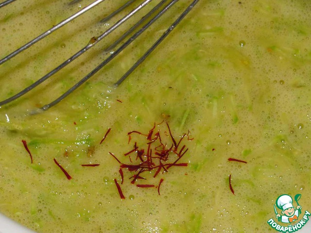 Яйца взбить с оставшейся половиной сырых цуккини, добавить соль, лимонный перец, шафран и тщательно перемешать.