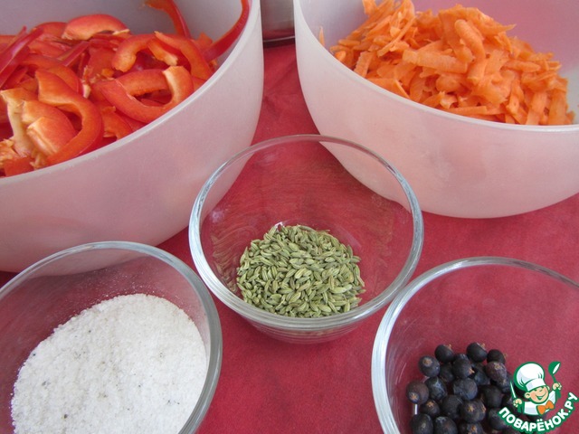 Подготовить все ингредиенты: отмерить соль и пряности (на выбор - фенхель, тмин), нашинковать перец и морковь (ножом или в комбайне). Если добавлять свеклу - измельчать как морковь. Яблоки (осенние, типа Антоновки) - нарезать ломтиками, удалив семенную камеру.