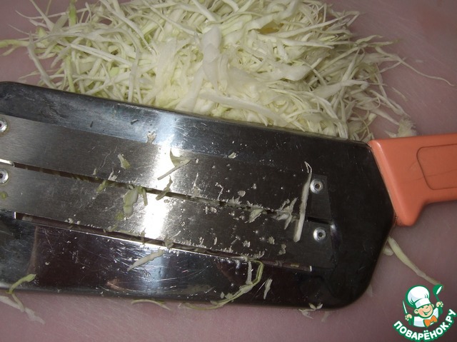 Качан разрезать пополам и нашинковать. Специальный нож облегчает и ускоряет работу.