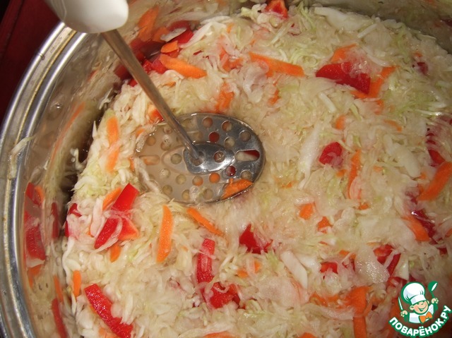 В большую стеклянную миску откладывать порцию капусты, присыпать солью и немного ее, капусту, перетереть ("пожамкать") рукой - до выделения сока. Не переусердствовать! - отжимать сок не надо.