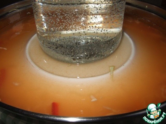 Накрыть тарелкой и сверху поставить гнет - банку или кастрюлю с водой. Ее количество легко регулировать. На фото - гнет тяжеловат.