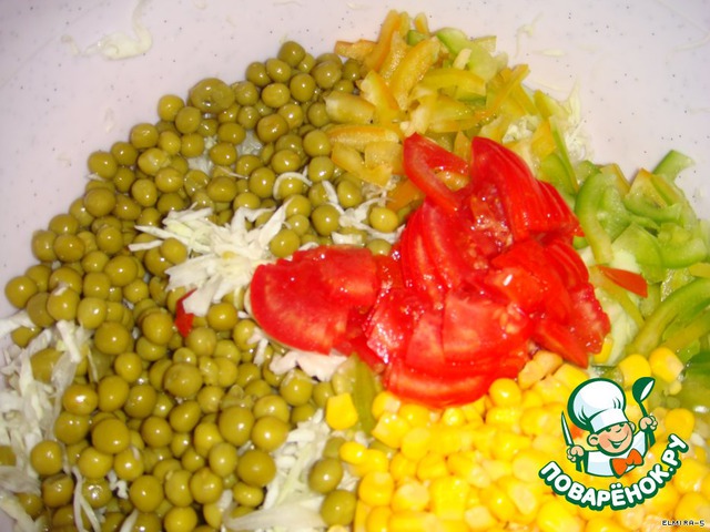 Добавить кукурузу,мелко порезанный перец болгарский(жёлтый и зелёный)