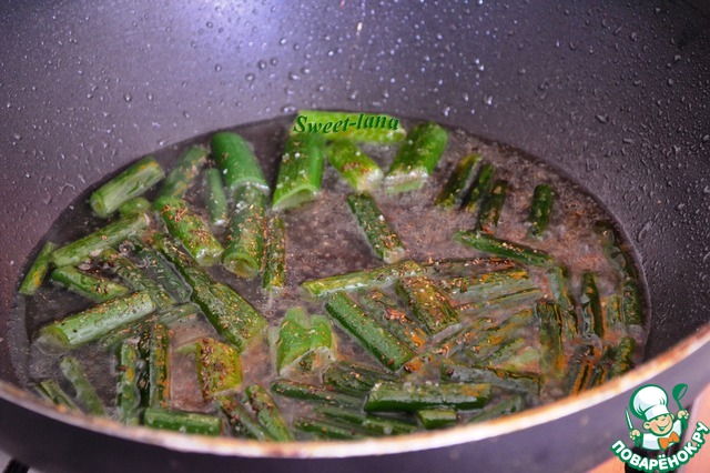 Нарезать стрелки кусочками длиной 6-7 см, выложить на сковородку с растительным маслом, жарить, помешивая, 2-3 минуты.
