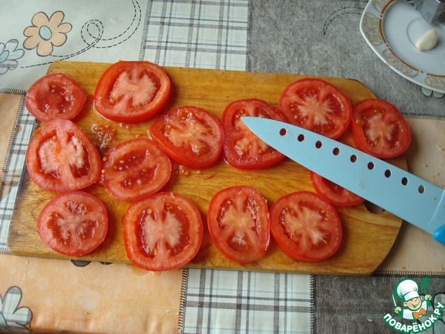 Затем нарежьте помидоры кружочками, толщина которых будет зависеть от уровня голода ваших гостей.
