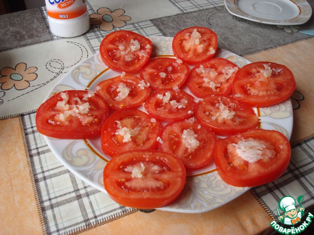 Выложите помидорные кружочки на большую тарелку или блюдо, посолите их по вкусу и положите на каждый помидор давленый чеснок (также по вкусу). Не переборщите с чесноком, иначе ваши партизаны вооружатся огнеметами и будут слишком жгучими.