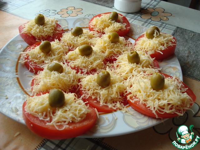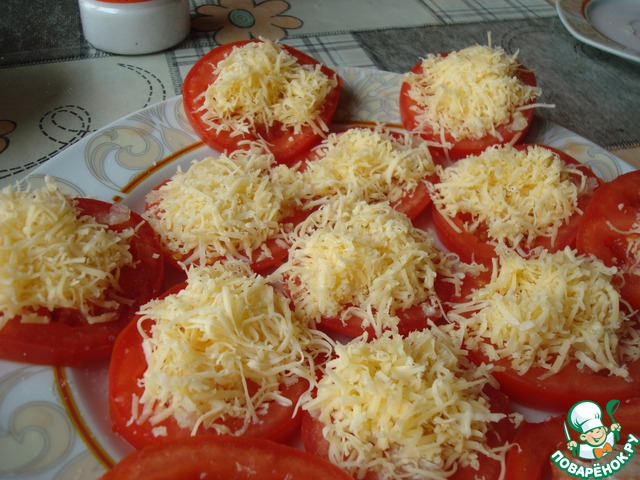 Некоторым нравится сначала намазать помидорки майонезом, а уж потом сыпать сыр. Я так не делаю, но так тоже вкусно.