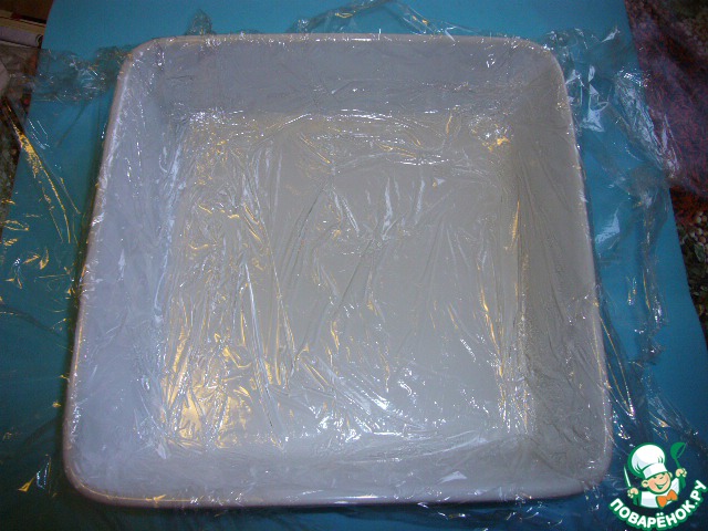 Форму выстелить пищевой пленкой, смазать растительным маслом.