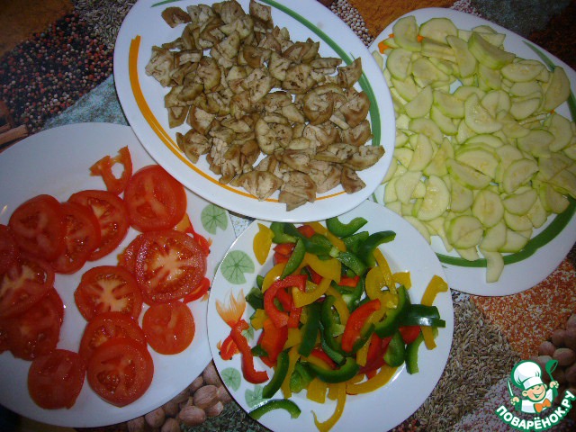 Кабачки и баклажаны очистить от кожицы, перцы освободить от семян и перепонок. Порезать кабачки на тонкие дольки, баклажаны и перцы - на четвертинки, помидоры - кружками. Бланшировать в кипящей подсоленной воде кабачки - 5 минут, баклажаны и перцы - 8 минут, помидоры - 5 минут.