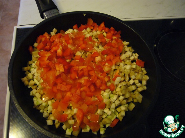 Пока овощи остывают, приступим к приготовлению овощного соуса. Для этого, мелко порезать, оставленные для этого овощи: 1/2 баклажана, 1/2 кабачка и 1 помидор. Обжарить на растительном масле в глубокой сковороде.