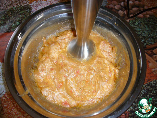 Полить сверху (размазывать, т. к. соус густоват) овощным пюре с желатином.