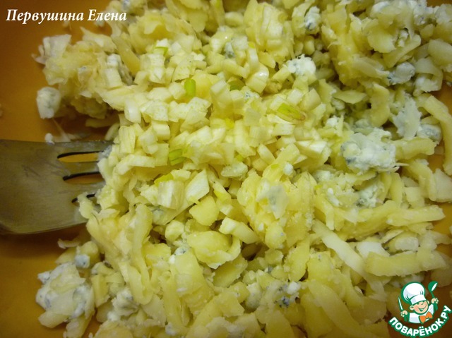 Пока блины жарятся ( не прозевайте их!), сделать начинку из тертого на терке сыра, измельченного чеснока,