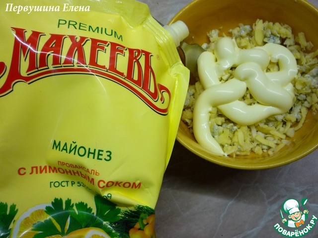 майонеза и зелени. Обязательно хорошенько растереть, чтобы чеснок распределился равномерно.