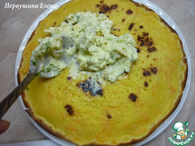 равномерно ее размазывать по всей поверхности блина. Сверху накрыть вторым блином. Его так же смазать начинкой, накрыв третьим и т. д.