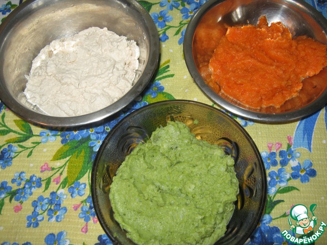 Куриное филе, морковь, брокколи измельчить в блендере в пюре, подливая сливки, посолить по вкусу. В овощи добавить по 2 стол. ложки сливок, в мясо - 4ст, л. (можно добавить больше, смотрите по консистенции).