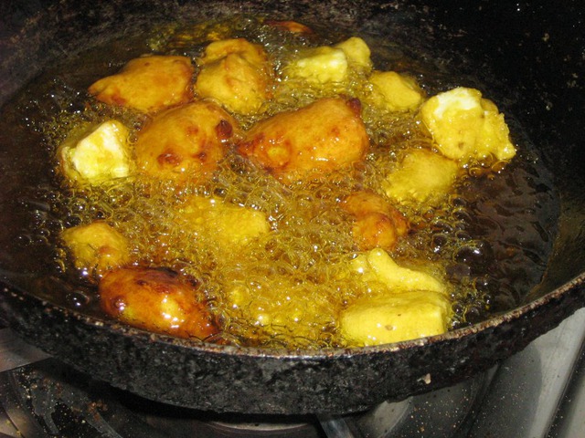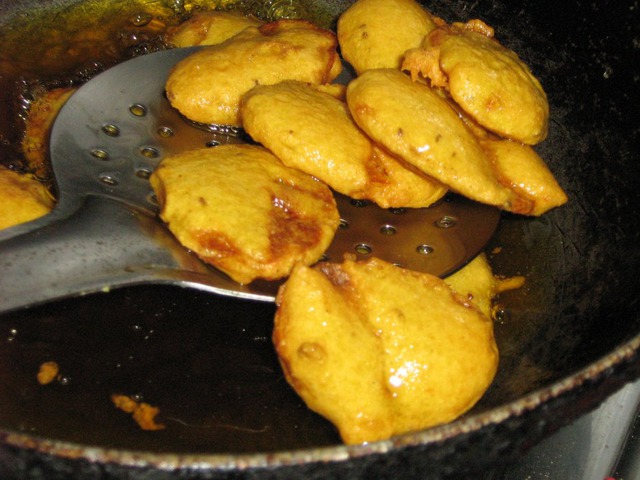 | Пакори - это кусочки овощей или панира (пресный сыр типа адыгейского) жаренные в тесте. Тесто, как правило, делают из бесан - муки из гороха нут (чхоле, нохут). Самые распространeнные пакори из панира, картофеля, баклажан, помидора, лука, листьев шпината. Эту закуску подают с соусом чатни (рецепт напечатан ранее) или с кетчупом. Едят непременно с пылу-жару, хрустящие. Я готовила пакори из панира, картофеля и баклажанов. |