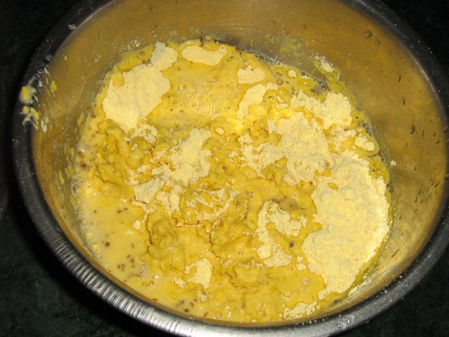 Делаем тесто из муки бесан, соли, тмина и воды, консистенция как на блины.