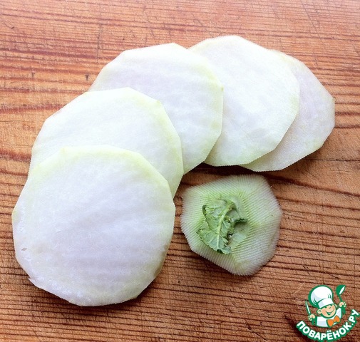 Кольраби очистить и нарезать пластинками, толщиной в 3-5 мм.