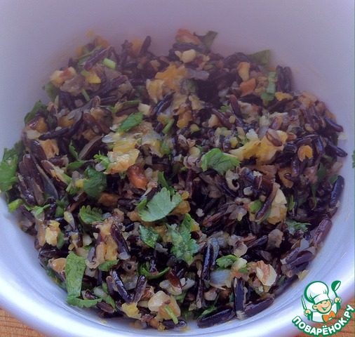 В остывший рис добавить грецкие орехи и зелень кинзы. Попробуйте, может быть, Вам захочется присолить или поперчить.