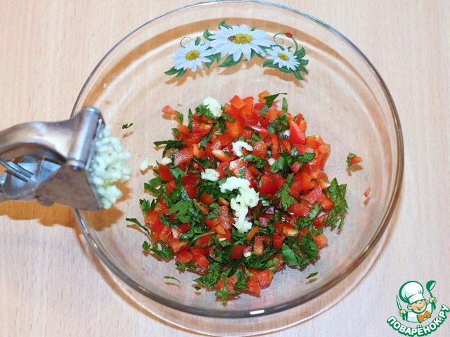Чеснок очищаем и нарезаем очень мелко. Можно пропустить его через пресс.