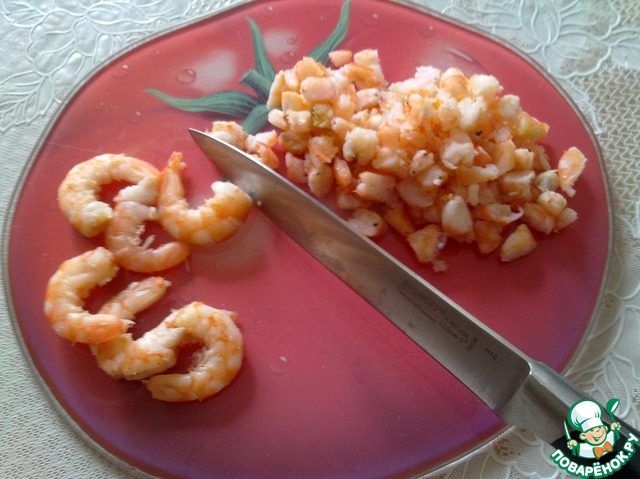 Креветки отварить, в кипящей подсоленной воде, очистить и измельчить.