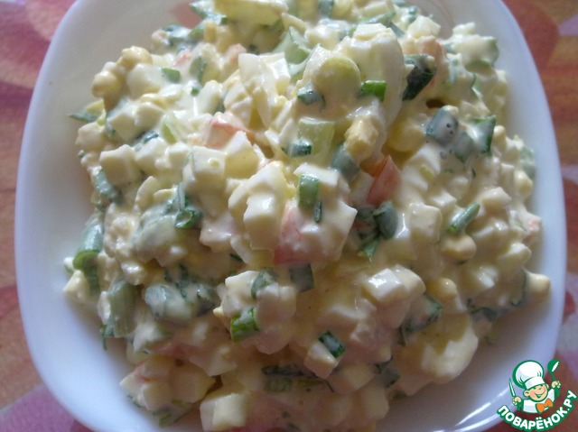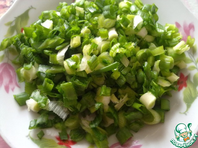 Мелко нарезать чеснок, добавить к измельченным яйцам, креветкам и зеленому луку. Все хорошо перемешать.