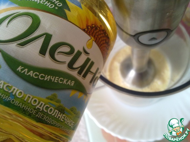 Не прекращая взбивать, вливаем лимонный сок и подсолнечное масло "Олейна". Получается легкий домашний майонез.