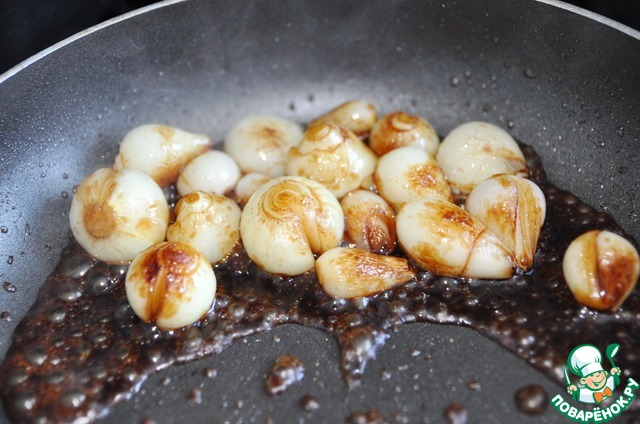 Берём лук-шалот или мелкий репчатый лук, чистим и обжариваем до румяности на растительном масле, постоянно встряхивая сковороду.